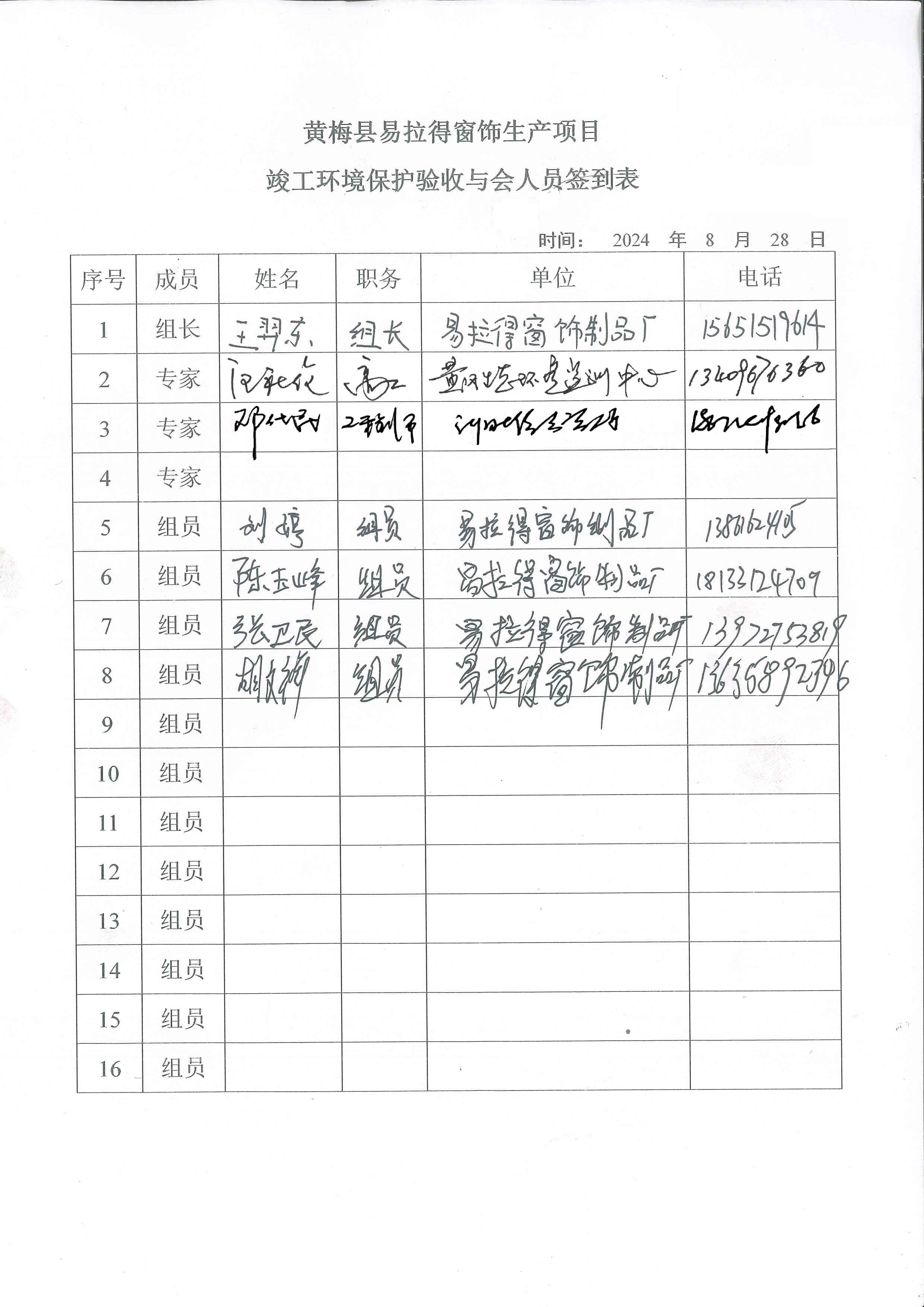 2024年8月28日,黃梅縣易拉得窗飾產(chǎn)品廠在黃岡市黃梅縣主持召開了《黃梅縣易拉得窗飾生產(chǎn)項(xiàng)目竣工環(huán)境保護(hù)驗(yàn)收監(jiān)測報(bào)告表》技術(shù)評(píng)估會(huì)。